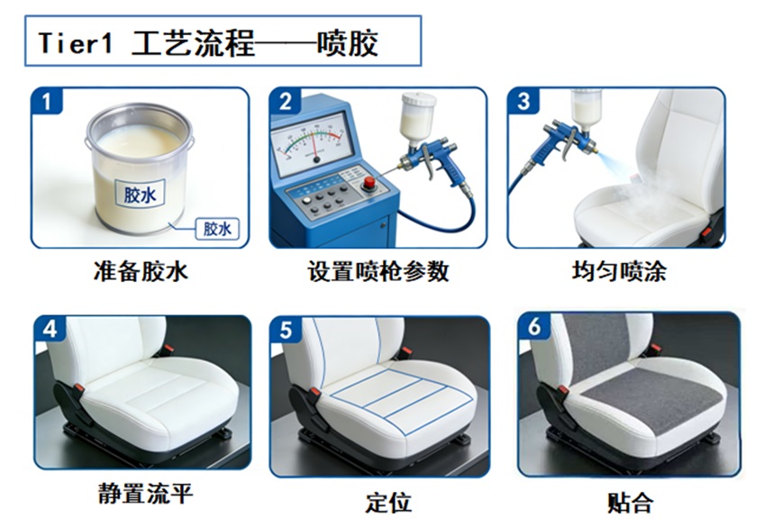 另一方面是噴膠的使用有時間限制,必須現(xiàn)噴現(xiàn)貼,這六個步驟只能在座椅廠一步步完成。